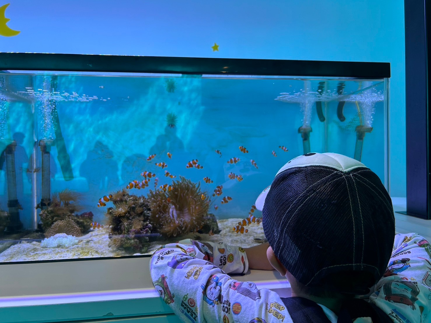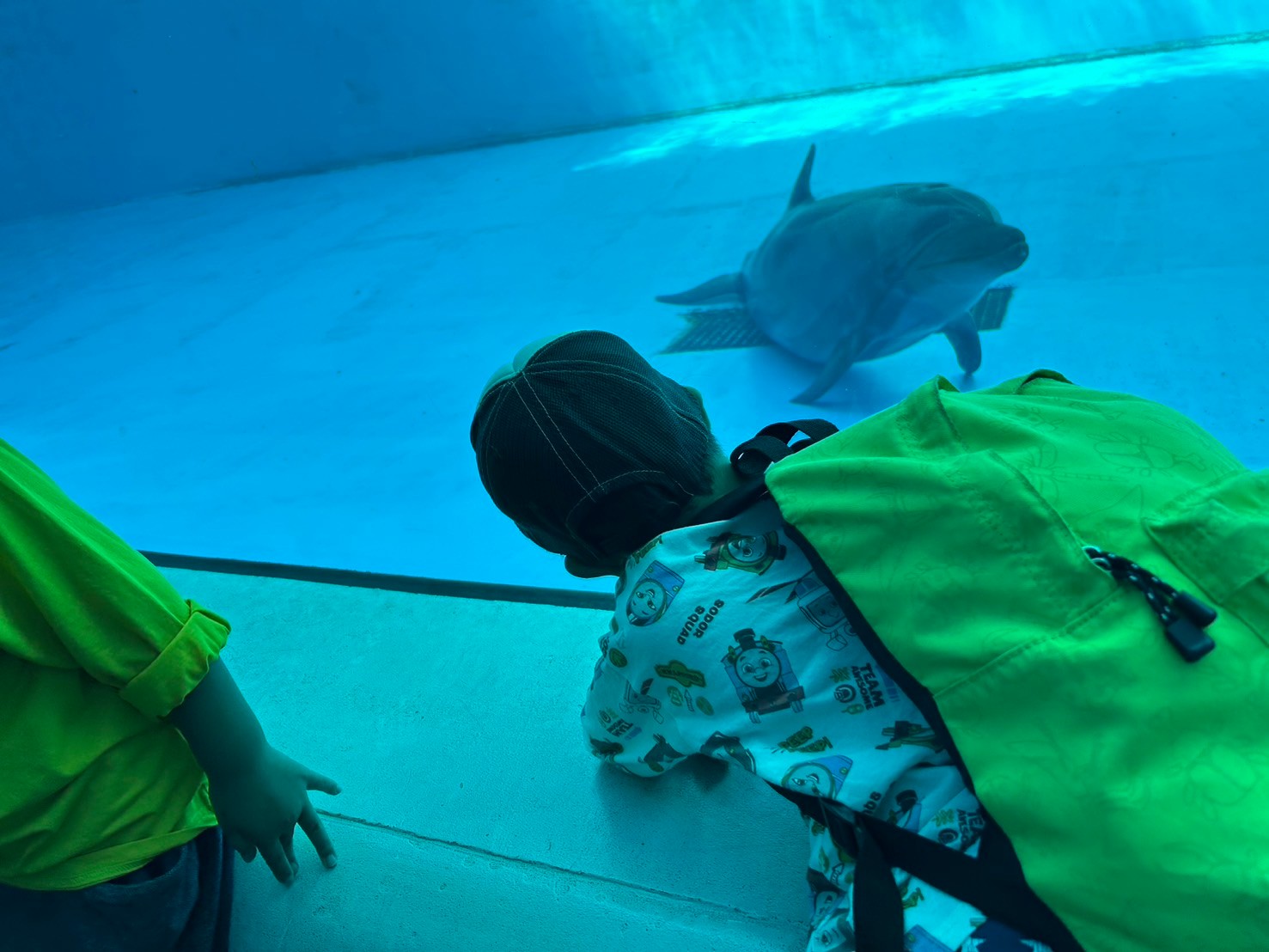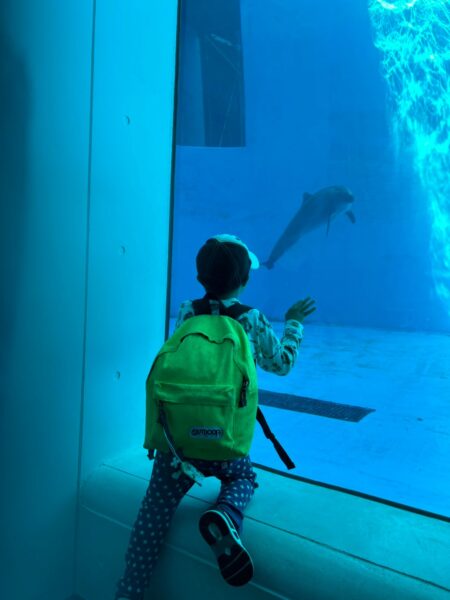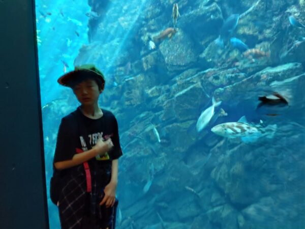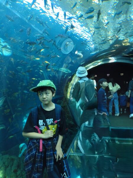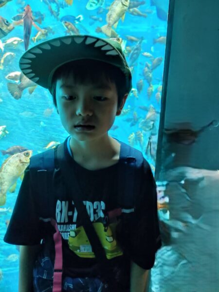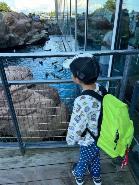 イルカやゴマフアザラシの大型水槽にへばりついて見入ったり、鯉のいけすでは今にも鯉に触れそうなところまで手を伸ばしたりと大好きな魚たちを見て興奮しっぱなしの様子でした。お兄さんお姉さんグループはじっくりとエビやクラゲの水槽を見て回っていました。特にお気に入りで見ていたのは、サメの水槽だったようです。やはり子どもたちは見た目も雰囲気も強そうな動物に憧れますね。